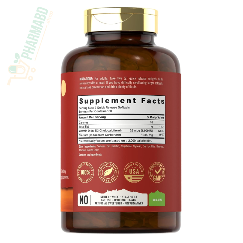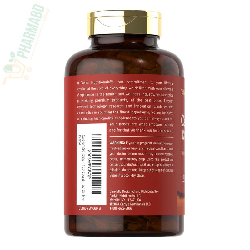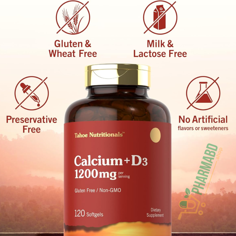 - Experience this complementary duo of nutrients with Tahoe Nutritionals! Our supplement provides 1,200 mg of Calcium (as Calcium Carbonate) per serving plus 25 mcg (1,000IU) Vitamin D3, in convenient, quick-release softgels. It's gluten-free and non-GMO, making it a great supplement of choice for adult men and women everywhere! Enjoy our 120-count supply today!