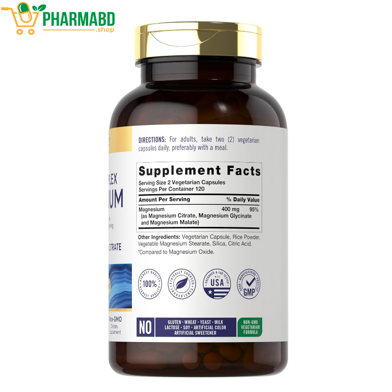 - At Carlyle, each serving of our Triple Complex Magnesium features a unique 400 mg blend of Magnesium Malate, Glycinate, and Citrate. Vegetarian capsules are gluten-free and non-GMO, made with no artificial color or sweetener, making them a top choice of Magnesium for adults everywhere!