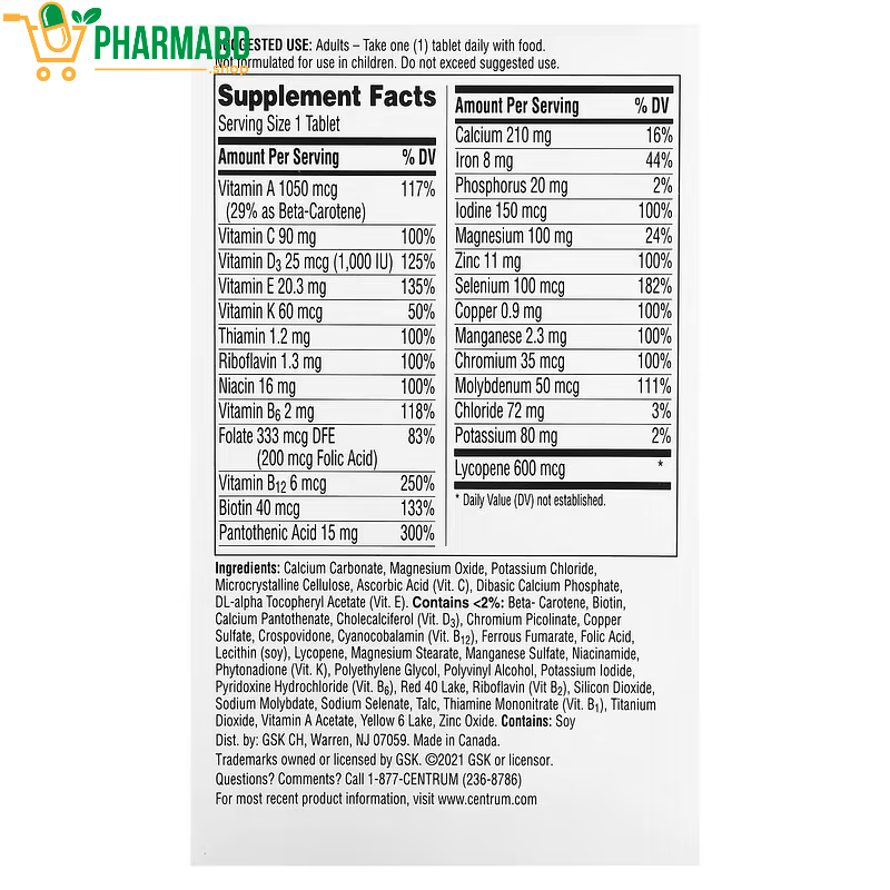 Ans: Calcium carbonate, magnesium oxide, potassium chloride, microcrystalline cellulose, ascorbic acid (vit. c), dibasic calcium phosphate, dl-alpha tocopheryl acetate (vit. e). contains <2%: beta- carotene, biotin, calcium pantothenate, cholecalciferol (vit. d3), chromium picolinate, copper sulfate, crospovidone, cyanocobalamin (vit. b12), ferrous fumarate, folic acid, lecithin (soy), lycopene, magnesium stearate, manganese sulfate, niacinamide, phytonadione (vit. k), polyethylene glycol, polyvinyl alcohol, potassium iodide, pyridoxine hydrochloride (vit. b6), red 40 lake, riboflavin (vit b2), silicon dioxide, sodium molybdate, sodium selenate, talc, thiamine mononitrate (vit. b₁), titanium dioxide, vitamin a acetate, yellow 6 lake, zinc oxide. Contains: Soy