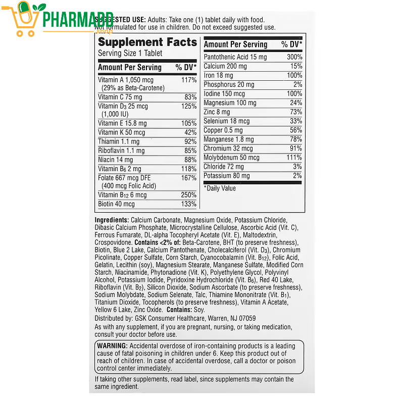 Ans: Calcium carbonate, magnesium oxide, potassium chloride, dibasic calcium phosphate, microcrystalline cellulose, ascorbic acid (vit. c), ferrous fumarate, dl-alpha tocopheryl acetate (vit. e), maltodextrin, crospovidone. contains <2% of: beta-carotene, bht (to preserve freshness), biotin, blue 2 lake, calcium pantothenate, cholecalciferol (vit. d3), chromium picolinate, copper sulfate, corn starch, cyanocobalamin (vit. b12), folic acid, gelatin, lecithin (soy), magnesium stearate, manganese sulfate, modified corn starch, niacinamide, phytonadione (vit. k), polyethylene glycol, polyvinyl alcohol, potassium iodide, pyridoxine hydrochloride (vit. b6), red 40 lake, riboflavin (vit. b2), silicon dioxide, sodium ascorbate (to preserve freshness), sodium molybdate, sodium selenate, talc, thiamine mononitrate (vit. b1), titanium dioxide, tocopherols (to preserve freshness), vitamin a acetate, yellow 6 lake, zinc oxide. Contains: Soy.