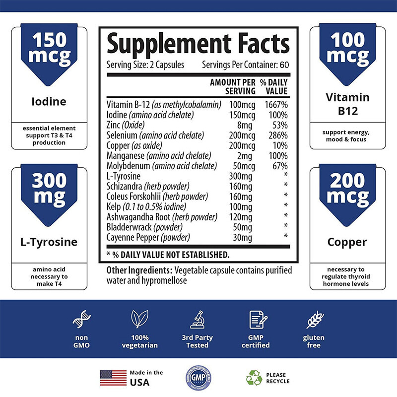 - 🔹 স্বাভাবিক হরমোন সংশ্লেষণ সমর্থন: L-Tyrosine এবং Iodine শরীরকে থাইরয়েড হরমোন (T3/T4) তৈরি ও উৎপাদনে raw materials দিতে সাহায্য করে।