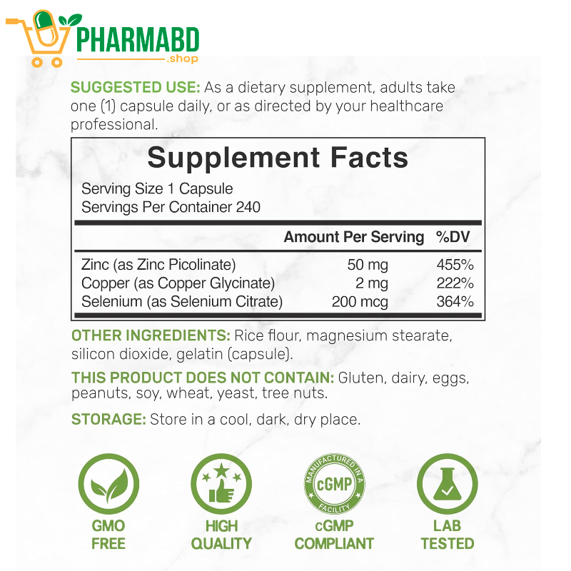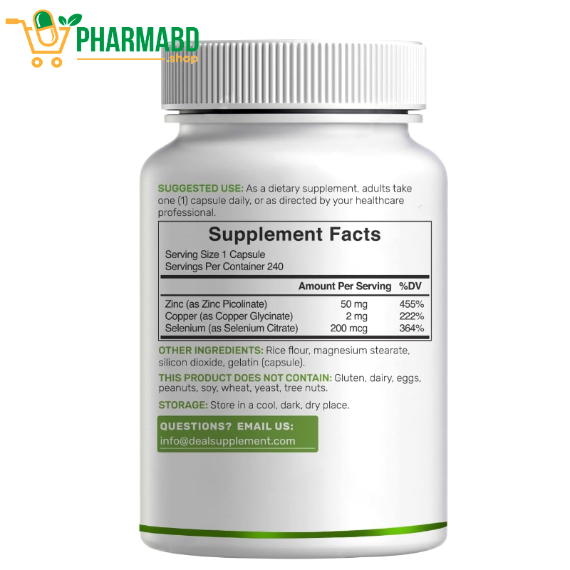 - Deal Supplement Zinc with Selenium + Copper হলো একটি Mineral-Based Nutritional Supplement, যেখানে তিনটি অত্যন্ত গুরুত্বপূর্ণ ট্রেস মিনারেল একসাথে থাকে—