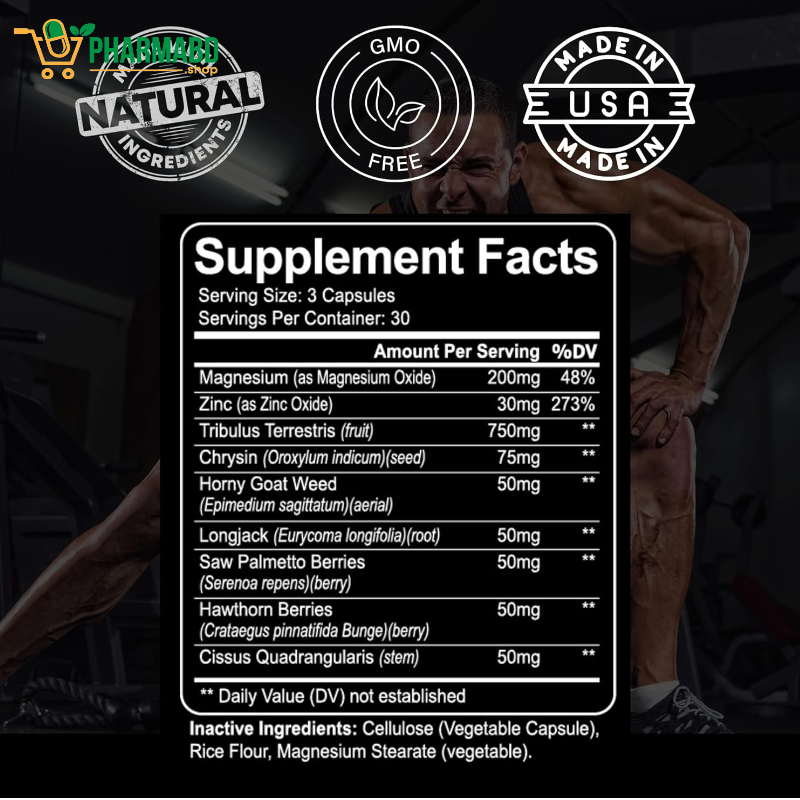 Ans: Magnesium (As Magnesium Oxide),Zinc (As Zinc Oxide),Tribulus Terrestris (Fruit),Chrysin (Oroxylum Indicum) (Seed),Horny Goat Weed (Epimedium Sagittatum)(Aerial),Longjack (Eurycoma Longifolia) (Root),Saw Palmetto Berries (Serenoa Repens) (Berry),Hawthorn Berries (Crataegus Pinnatifida Bunge)(Berry),Cissus Quadrangularis (Stem) Inactive Ingredients: Cellulose (Vegetable Capsule),Rice Flour,Magnesium Stearate (Vegetable)