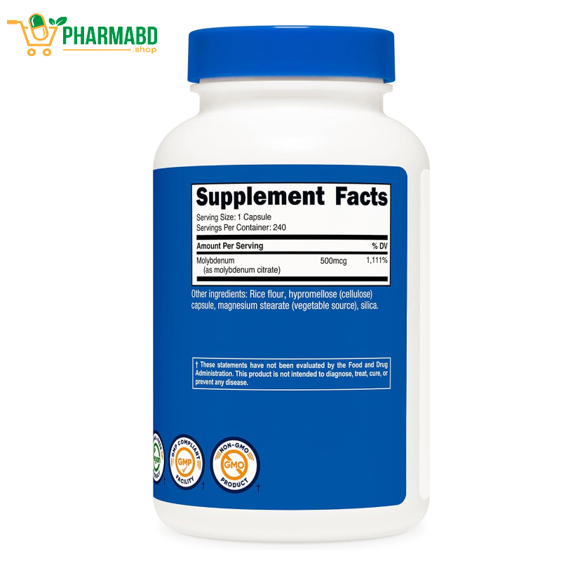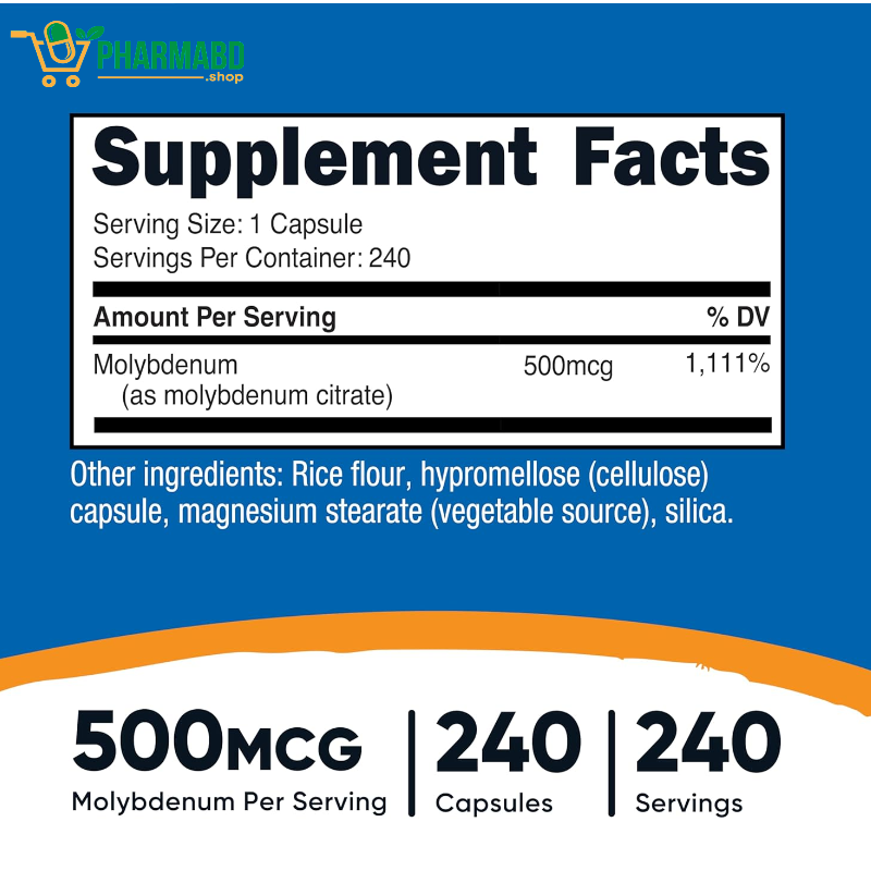Ans: Molybdenum (as molybdenum citrate), Rice flour, Hypromellose (cellulose) capsule, Magnesium stearate (vegetable source), Silica.
