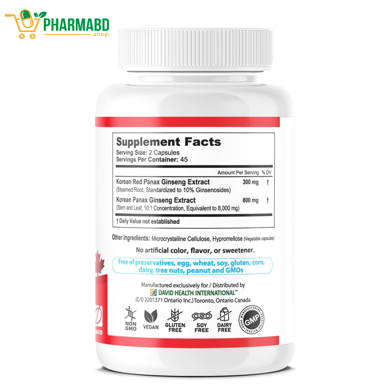 Ans: Each capsule contains - Korean Red Panax Ginseng Extract 300mg (Steamed Root, Standardized to 10% Ginsenosides), Korean Panax Ginseng Extract 800mg (Stem and Leaf, 10:1 Concentration, Equivalent to 8,000 mg). Other Ingredients: Microcrystalline Cellulose, Hypromellose (Vegetable capsules)