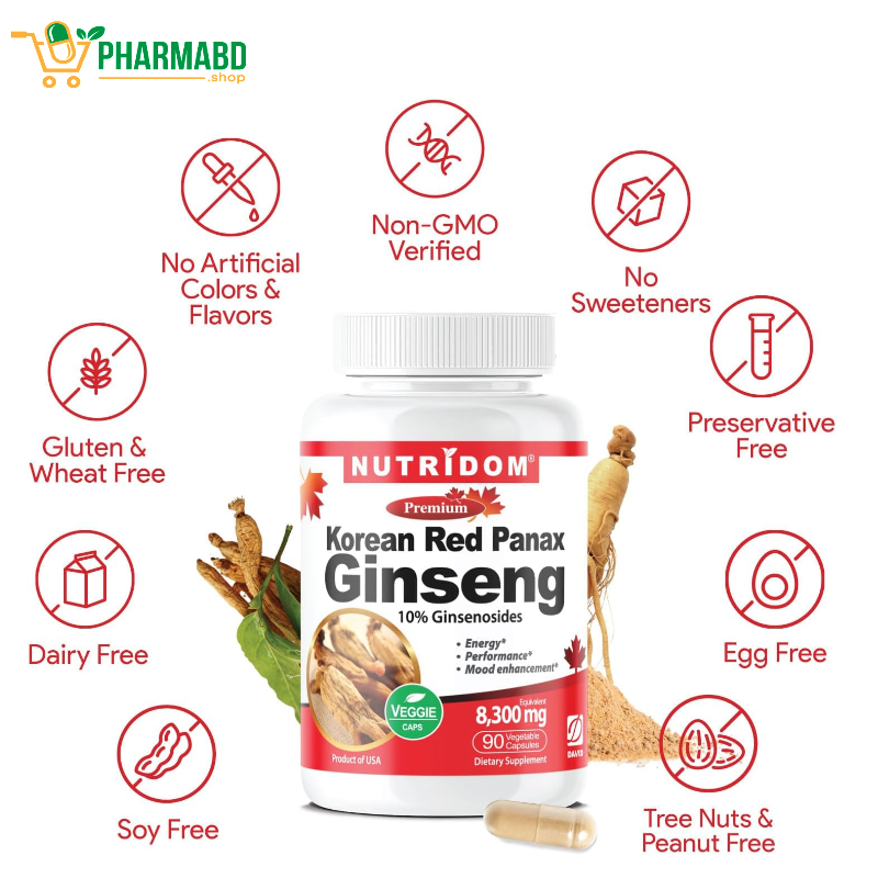 - Korean Red Panax Ginseng (Panax ginseng) হলো কোরিয়ার বিশেষভাবে প্রক্রিয়াজাত (steam & dry) জিনসেং, যা সাধারণ জিনসেং-এর চেয়ে বেশি শক্তিশালী ও কার্যকর। এতে উচ্চমাত্রার Ginsenosides থাকে, যা শরীর ও মস্তিষ্কে Adaptogen হিসেবে কাজ করে।