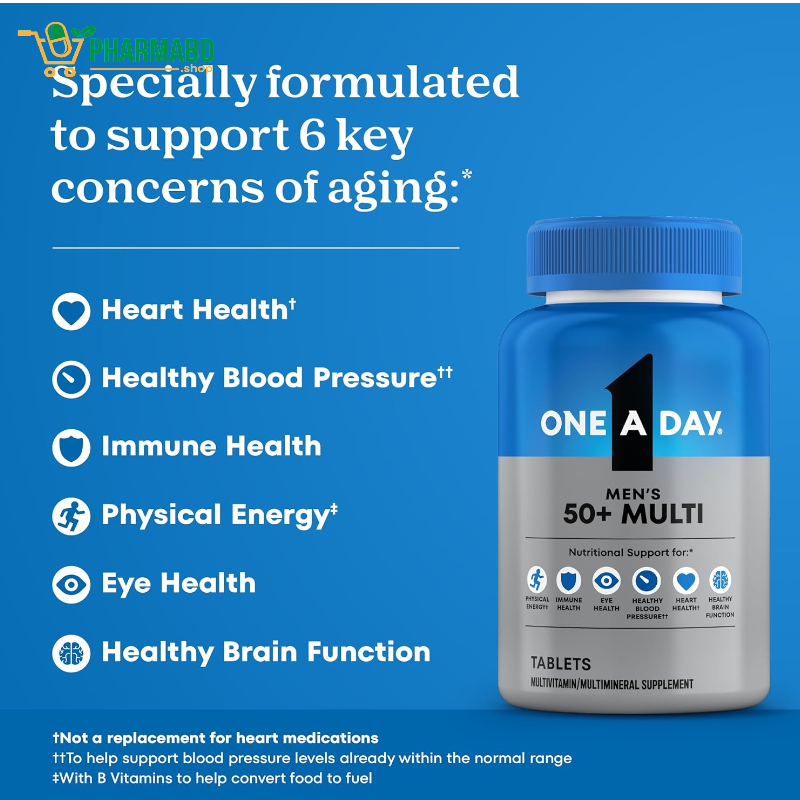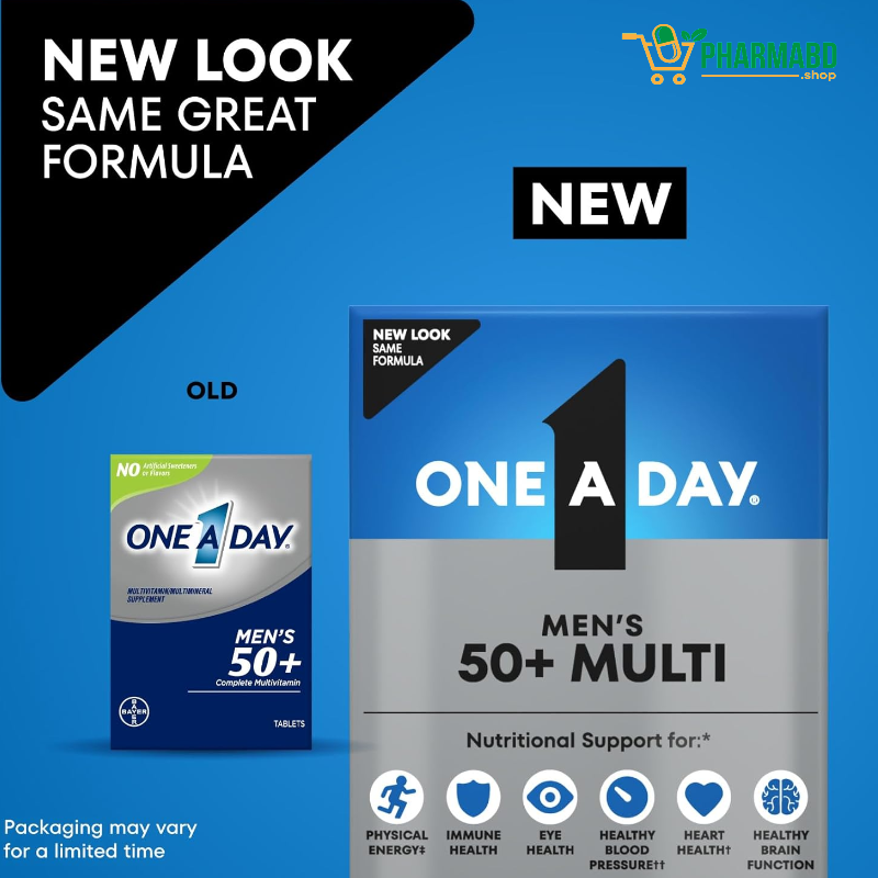 - One A Day Men’s 50+ Multivitamin হলো ৫০ বছরের বেশি বয়সী পুরুষদের জন্য বিশেষভাবে তৈরি একটি ডেইলি মাল্টিভিটামিন, যা তৈরি করে Bayer। এতে থাকে বয়স অনুযায়ী প্রয়োজনীয় ভিটামিন ও মিনারেল যেমন—