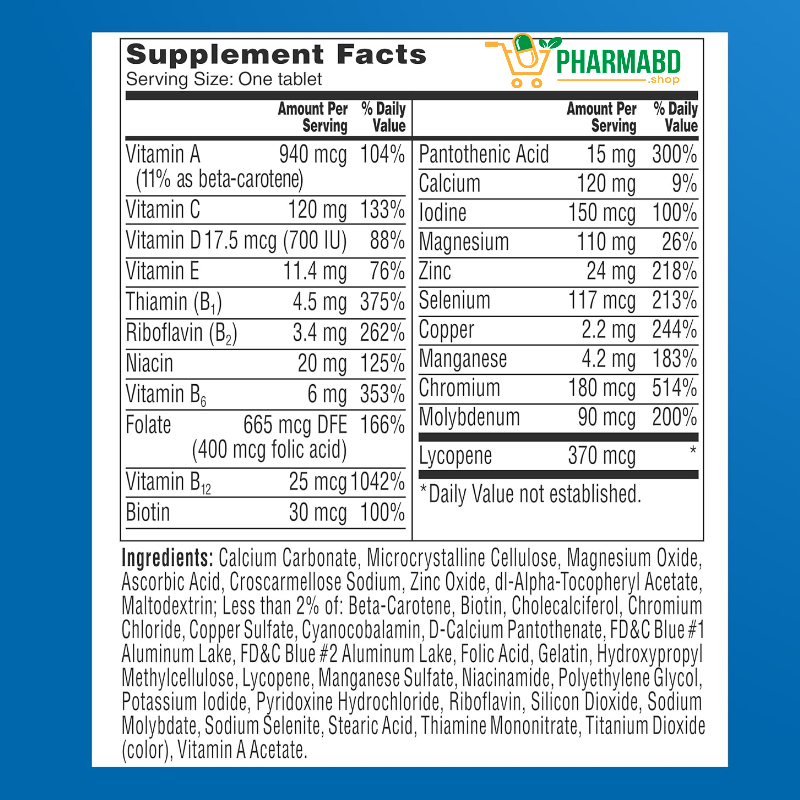 Ans: Calcium carbonate, microcrystalline cellulose, magnesium oxide, ascorbic acid, croscarmellose sodium, zinc oxide, dl-alpha-tocopheryl acetate maltodextrin; less than 2% of: beta-carotene, biotin, cholecalciferol, chromium chloride, copper sulfate, cyanocobalamin, d-calcium pantothenate, fd&c blue #1 aluminum lake, fd&c blue #2 aluminum lake, folic acid, gelatin, hydroxypropyl methylcellulose, lycopene, manganese sulfate, niacinamide, polyethylene glycol potassium iodide, pyridoxine hydrochloride, riboflavin, silicon dioxide, sodium molybdate, sodium selenite, stearic acid, thiamine mononitrate, titanium dioxide (color), vitamin a acetate. Free of: artificial flavors and artificial sweeteners and fish/shellfish, egg and dairy (milk) allergens.
