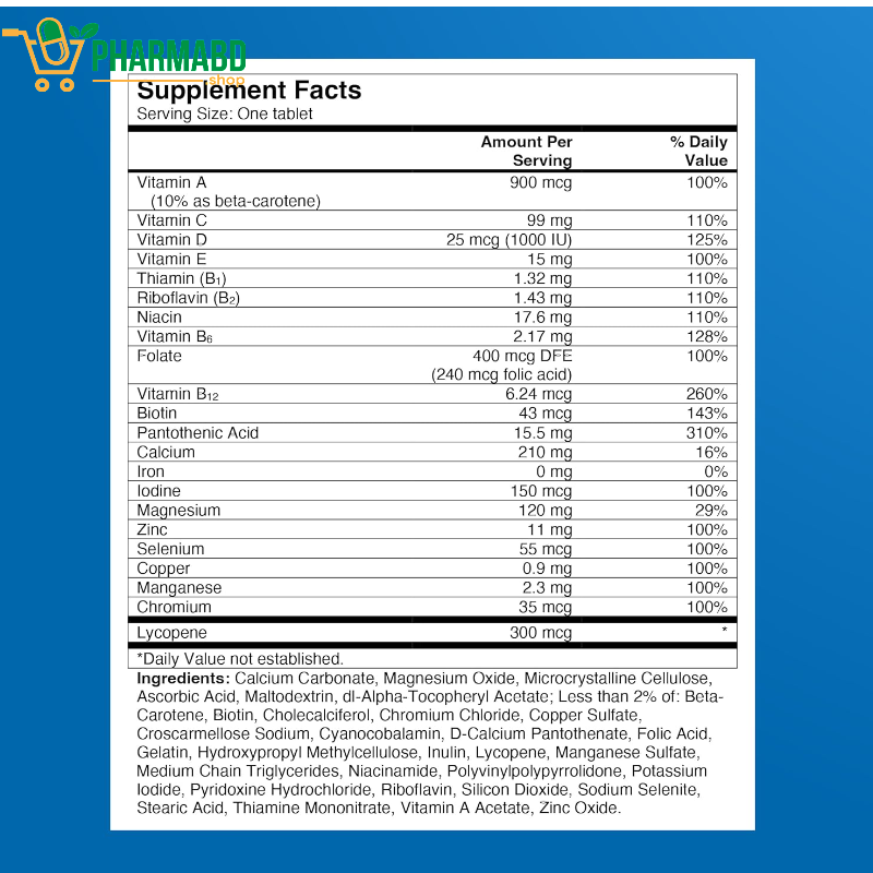 Ans: Vitamin A, as beta-carotene, Vitamin C, Vitamin D, Vitamin E, Thiamin (B1), Riboflavin (B2), Niacin, Vitamin B6, Folate, Vitamin B12, Biotin, Pantothenic Acid, Calcium, Iron, Iodine, Magnesium, Zinc, Selenium, Copper, Manganese, Chromium, Lycopene. Microcrystalline Cellulose, Maltodextrin, Croscarmellose Sodium, Gelatin, Hydroxypropyl Methylcellulose, Inulin, Medium Chain Triglycerides, Silicon Dioxide, Stearic Acid.