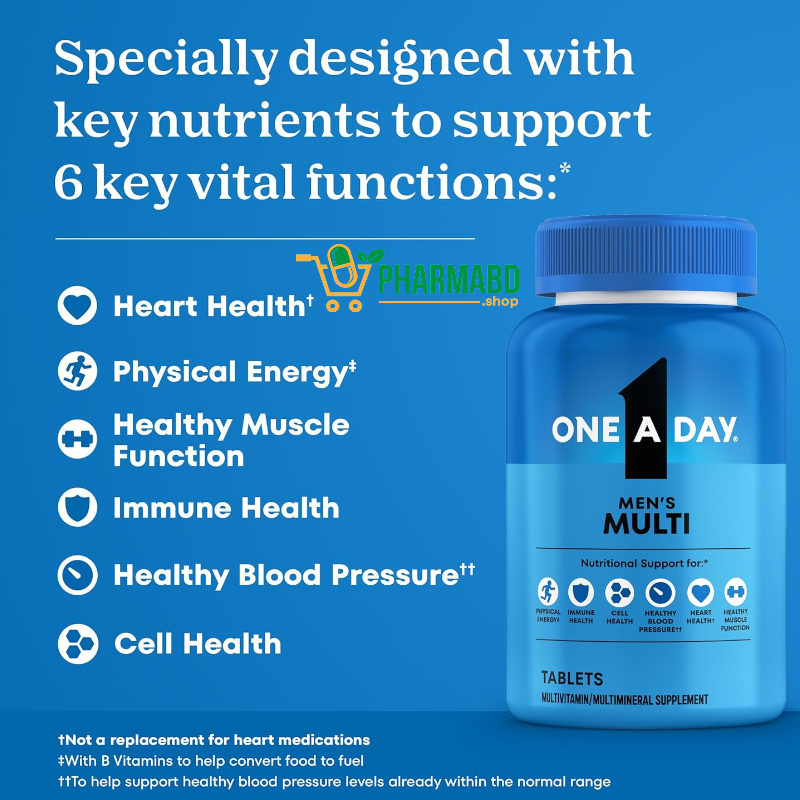 - 🔹 Men-specific formula, 🔹 One tablet per day (easy use), 🔹 Energy + Heart + Immune support, 🔹 100+ quality checks (brand claim), 🔹 দীর্ঘদিন ধরে trusted brand.