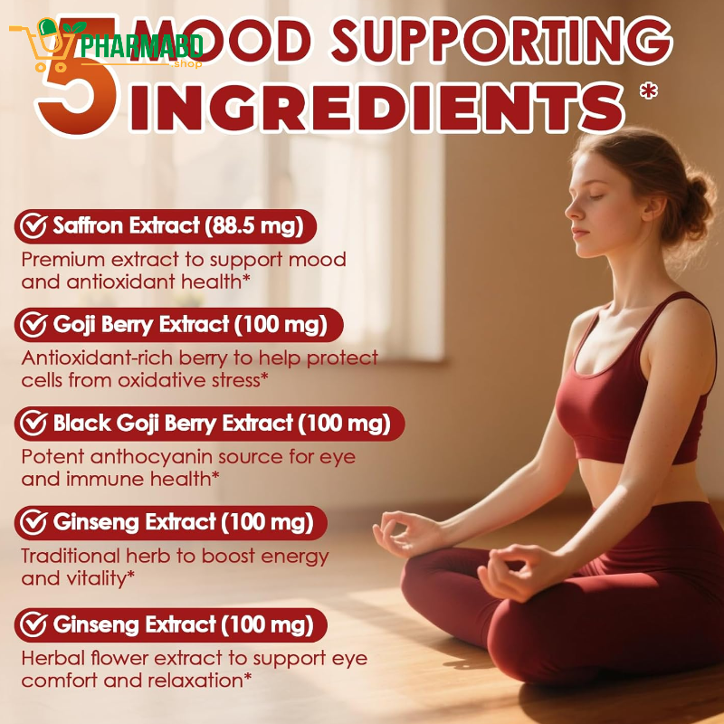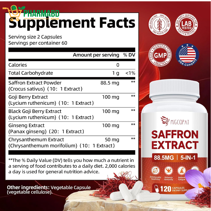 - Migcopat saffron supplements feature 88.5mg of premium 10:1 saffron extract, combined with goji berry, Panax ginseng, and chrysanthemum—5-in-1 herbal synergy traditionally used to help ease daily stress, reduce irritability, and support a balanced, positive mood.* This natural mood support supplement is ideal for those seeking emotional clarity and resilience.