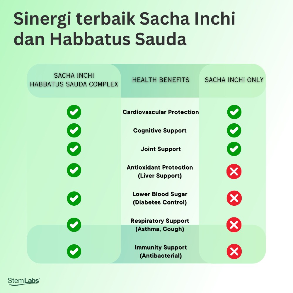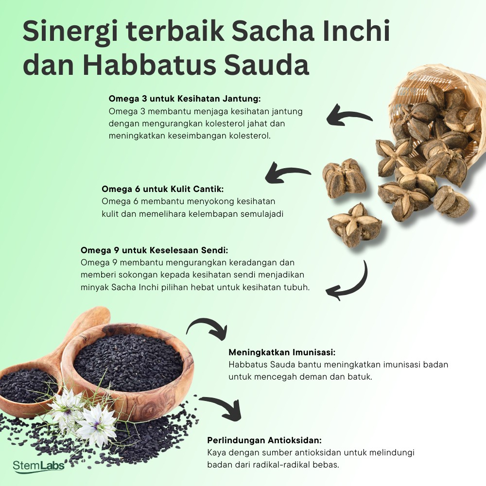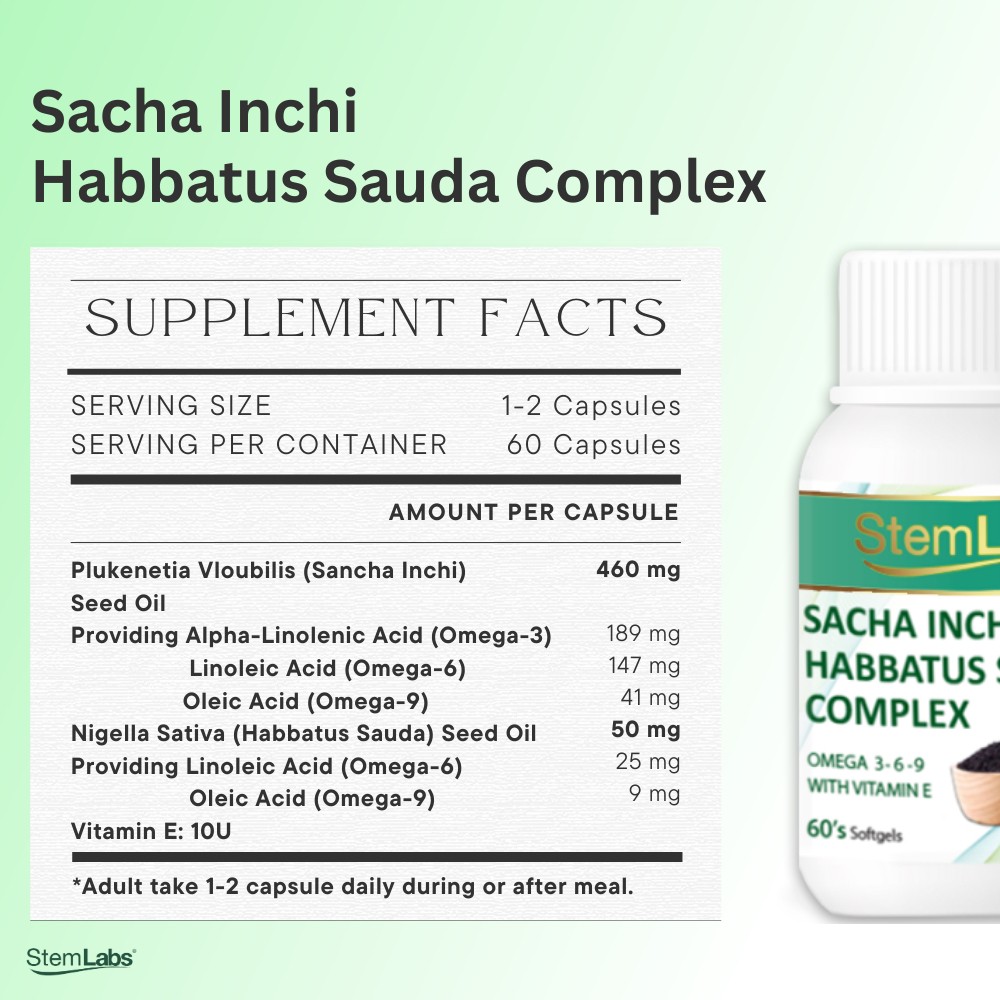 - Unlock the full spectrum of essential fatty acids with StemLabs Sacha Inchi Habbatus Sauda Complex, a meticulously formulated blend featuring 460mg of Sacha Inchi and 50mg of Habbatus Sauda. This comprehensive nutritional supplement goes beyond the ordinary, providing a holistic approach to support your overall health and well-being.