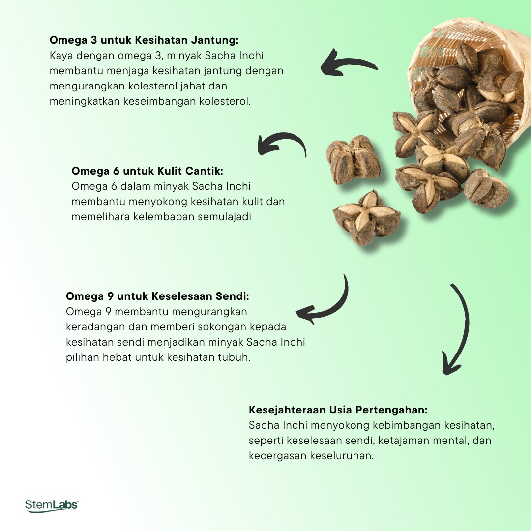 - Sacha Inchi oil, derived from the seeds of the Plukenetia volubilis plant, is renowned for its numerous health benefits and potential uses. Our Sacha Inchi Oil is MOH and JAKIM-approved.