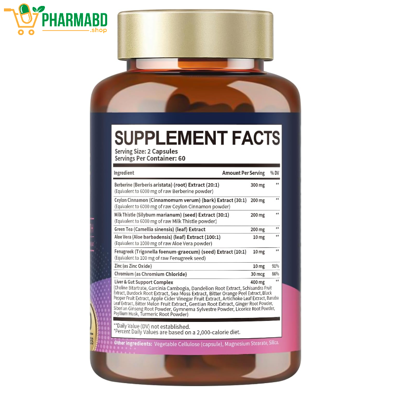 Ans: Berberine, Ceylon Cinnamon, Milk Thistle, Green Tea, Aloe Vera, Fenugreek Seed, Zinc Oxide, Chromium Chloride, Choline Bitartrate, Garcinia Cambogia, Dandelion, Schisandra, Burdock, Sea Moss, Bitter Orange, Black Pepper, Apple Cider Vinegar, Artichoke Leaf, Banaba, Bitter Melon, Gentian, Ginger Root Powder, Siberian Ginseng Powder, Gymnema Sylvestre Powder, Licorice Root Powder, Psyllium Husk, Turmeric Root