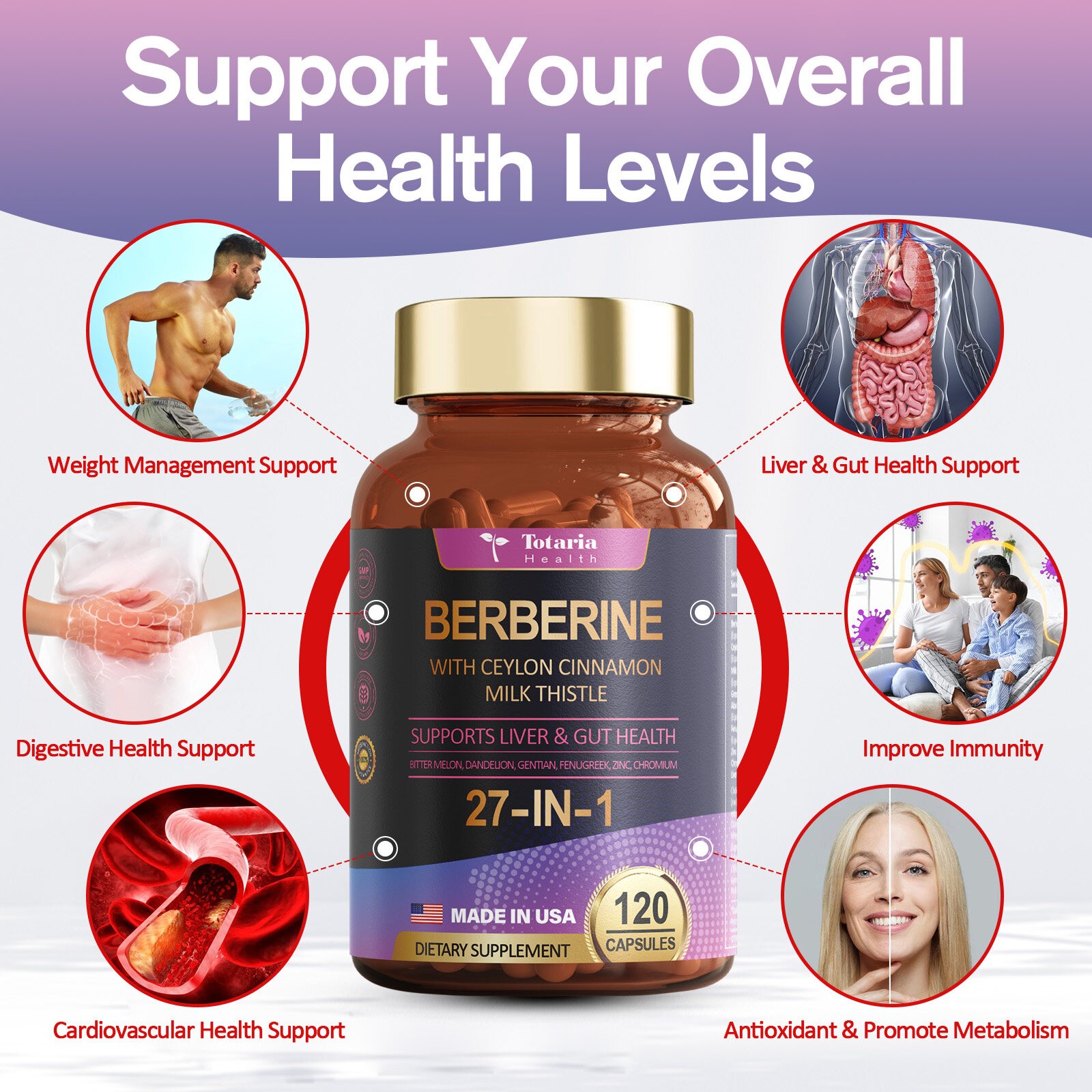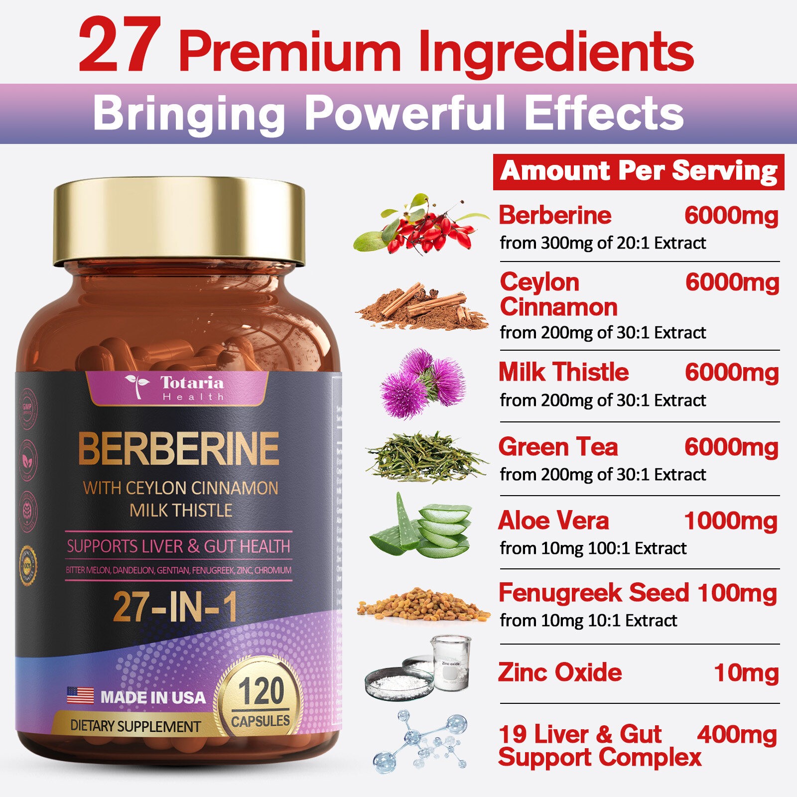 - Totaria Berberine Supplement, a perfect blend of selected Berberine, Ceylon Cinnamon, Milk Thistle, Green Tea, Aloe Vera, Fenugreek Seed, Zinc Oxide, Chromium Chloride, Liver & Gut Support Complex, high strength per serving.