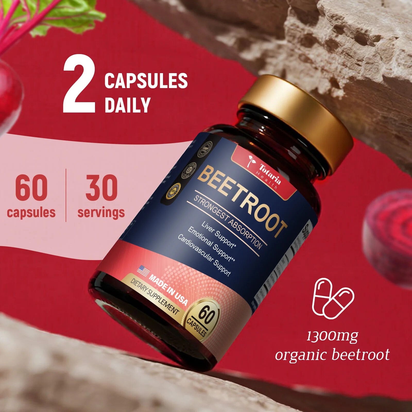 - Each serving of our Beetroot Capsules delivers 1300mg of premium organic beetroot powder, sourced from nutrient-dense red beets. This potent, natural superfood provides an easy and effective way to enhance your daily wellness routine. Perfect for gym-goers, athletes, or anyone with a demanding schedule, these capsules offer clean, stimulant-free energy. Packed with natural nitrates, they help support endurance, stamina, and an active lifestyle—without crashes or jitters. We prioritize purity and safety: ✔ Non-GMO & USDA Organic beets. ✔ Third-party lab tested for potency and contaminants. ✔ Free from gluten, dairy, soy, and artificial additives. A trusted, clean supplement you can take daily. Tired of messy beet juices or chalky powders? Our small, easy-to-swallow capsules deliver all the benefits of beetroot—without the taste or hassle. Just two capsules a day for convenient, on-the-go nutrition. Whether you're a fitness enthusiast, outdoor adventurer, or just seeking natural energy, these beetroot capsules seamlessly fit into your routine. A simple, effective way to enhance overall wellness and vitality.