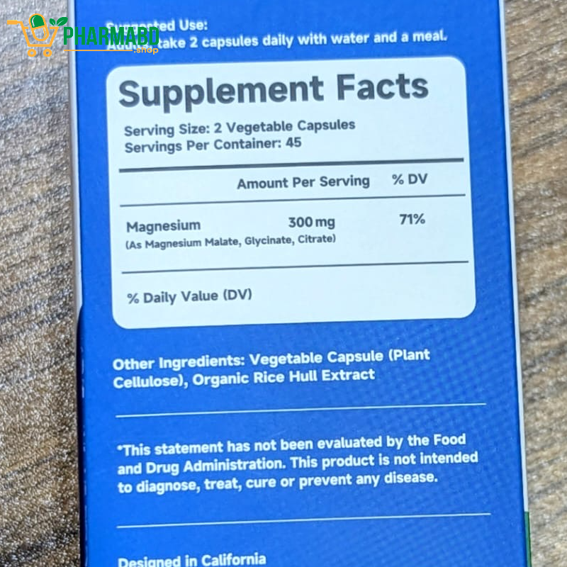 Ans: Magnesium Glycinate, Magnesium Citrate, Magnesium Malate, Vegetable Capsule (Plant Cellulose), Organic Rice Hull Extract